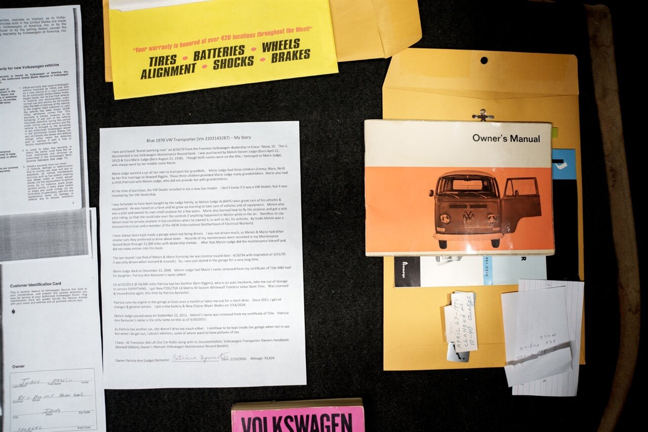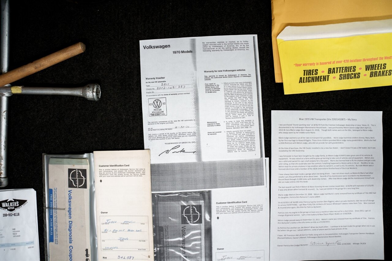 I was purchased “brand spanking new” on 4/30/70 from the Freeman Volkswagen dealership in Coeur ‘Alene, ID. This is documented in my Volkswagen Maintenance Record book. I was purchased by Melvin Steven Judge (Born April 21, 1912) & Cora Marie Judge (Born August 21, 1918). Though both names were on the title, I belonged to Marie Judge, who always went by her middle name Marie.